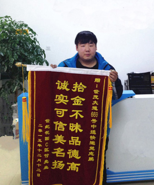 12月20日,一面寫有“拾金不昧品德高 誠實可信美名揚”字樣的錦旗被送到了中通快遞哈爾濱江北大學(xué)分部,失主對該分部快遞員楚志鵬無償歸還丟失錢物的行為再三表示感謝。